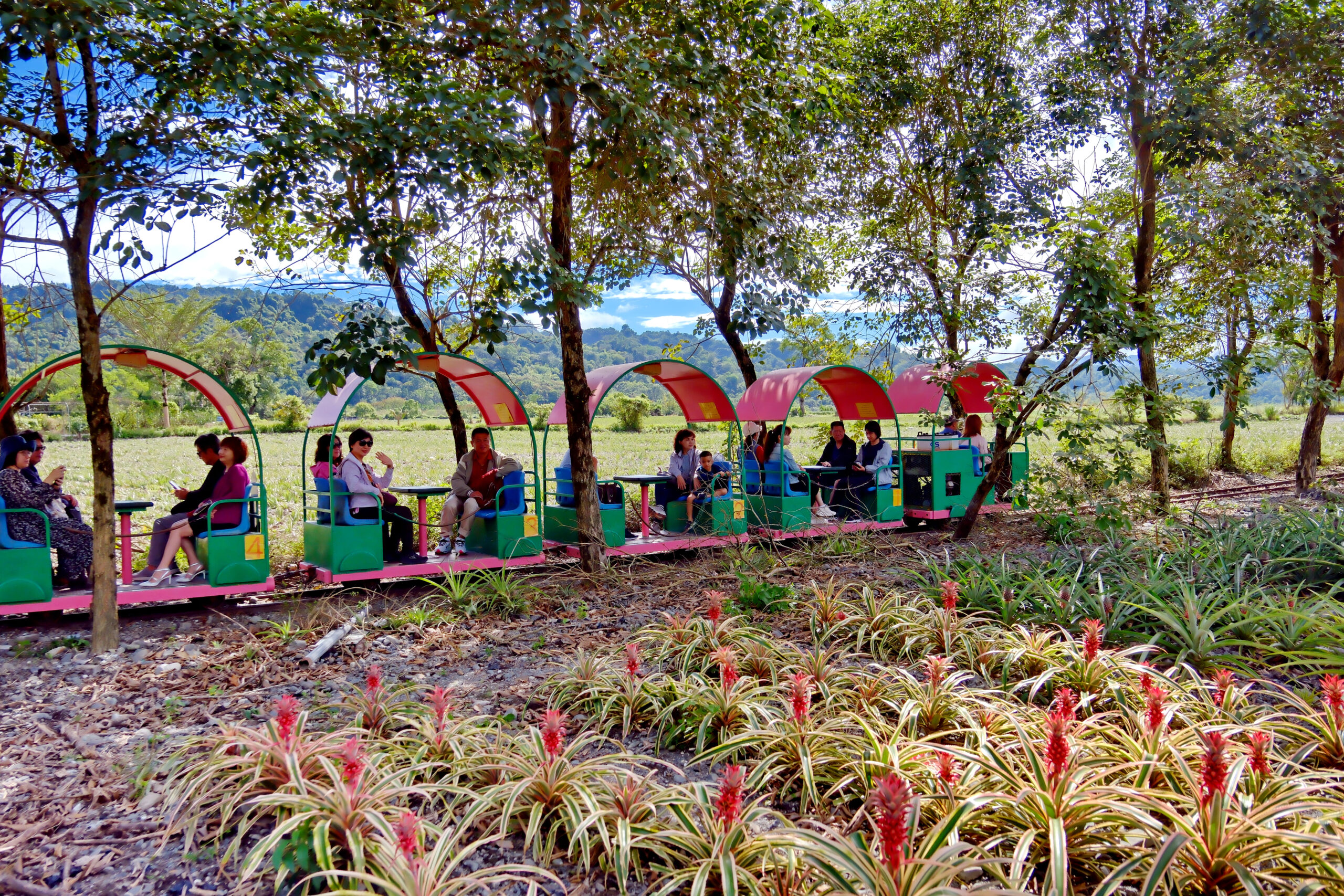 搭乘1314 幸福小火車遊造林地與由農用曳引機當火車頭的遊園車,穿梭於廣闊的鳳梨田與果園間,欣賞著田園風光之際,看到果樹就下車直接採果嘗鮮,大人小孩都超開心,是遊客的最愛!