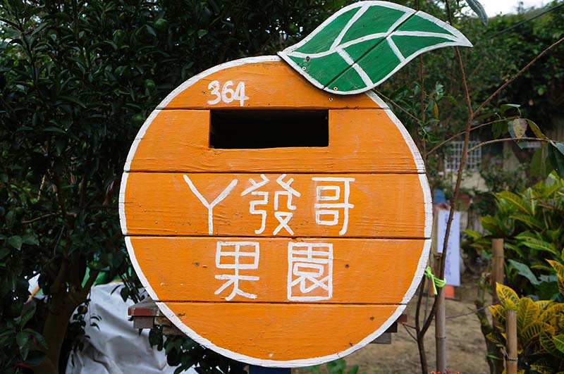 自國道交流道下來後,往大湖方向走台三線,經過蜿蜒的山中小路,象徵柑桔的橘色招牌「阿發哥果園」便在眼前,可愛的橘阿夢跟灰色大水牛佇立在果園旁…